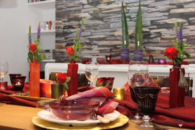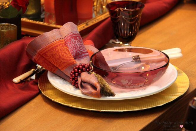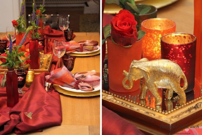Du planst auch einen orientalischen Abend wie in 1001 Nacht? Dann lass‘ es ruhig krachen. Du kannst den Tisch üppig und opulent dekorieren, wenn Du Dich an ein Farbschema hältst, kannst Du nichts falsch machen.