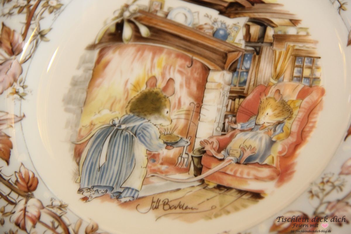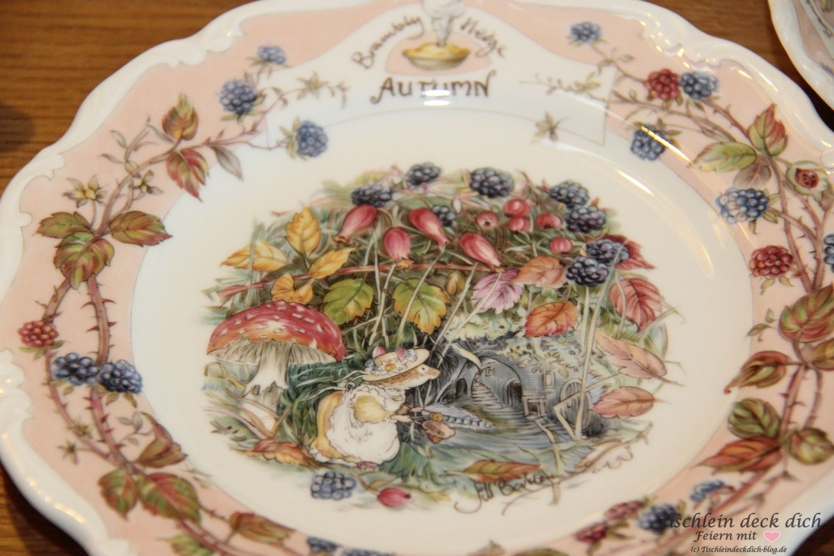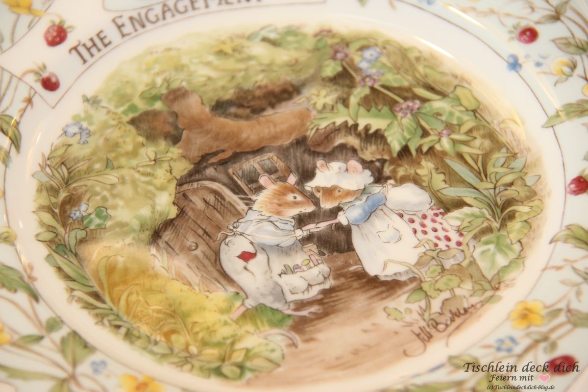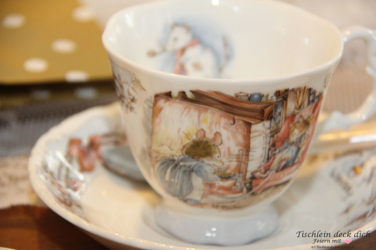 Seit mehr als 25 Jahren (oh je, wie doch die Zeit vergeht) steht das Porzellan von Bramley Hedge in unserem Schrank. Angefangen zu Sammeln habe ich es damals, als mir meine Freundin Gaby ein Schälchen zum Geburtstag schenkte und dieses nicht alleine bleiben sollte. Mittlerweile wird das Kaffeeservice eher selten bis gar nicht von mir genutzt. Ist eigentlich schade, wo doch Vintage und Shabby mittlerweile so beliebt geworden sind. Sie ist doch einfach zu putzig die kleine Mäusefamilie, deren Leben man auf Tellern und Tassen der Vier Jahreszeiten, Autumn- Winter- Spring-Summer, beiwohnen kann. Und da vier Gedecke doch meistens nicht reichen kam noch ‚ The Birthday‘ und ‚The Engagement‘ hinzu.