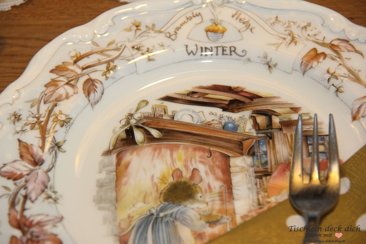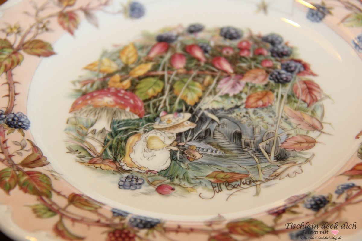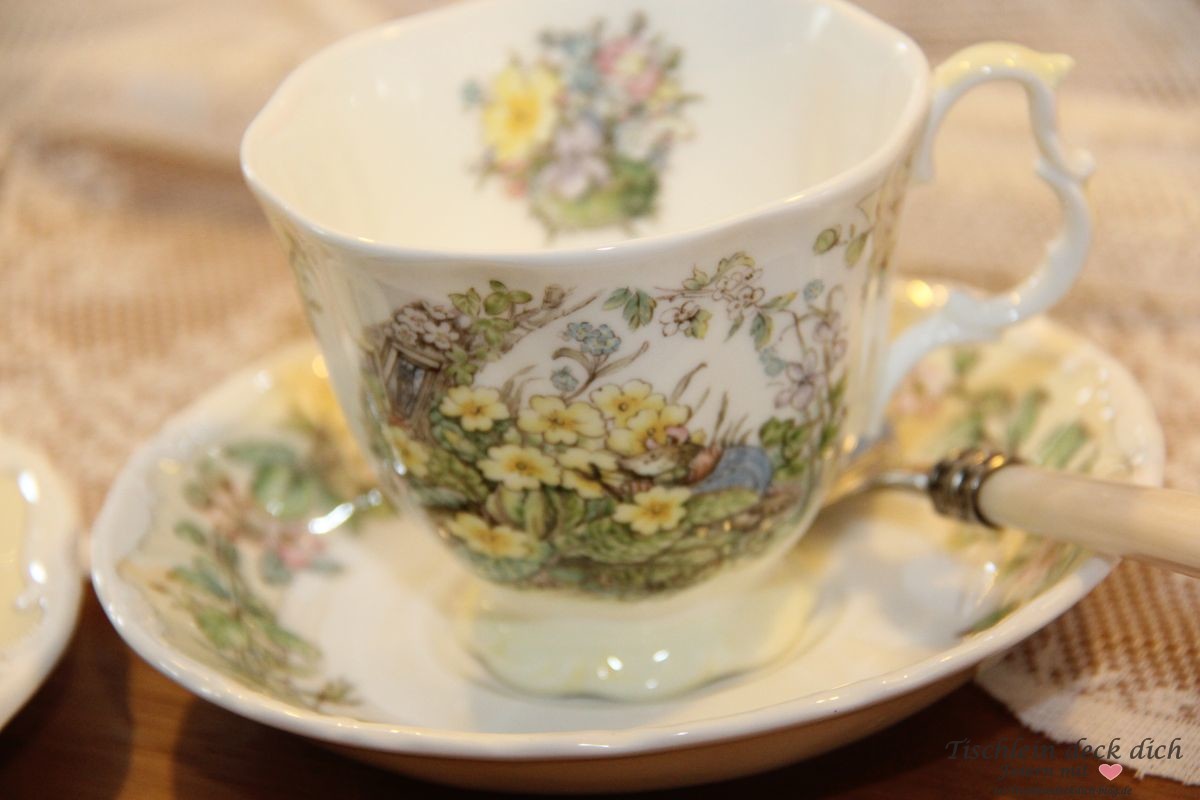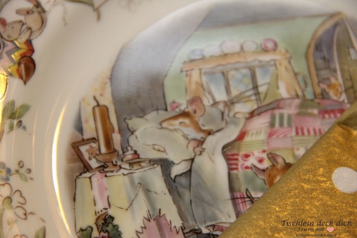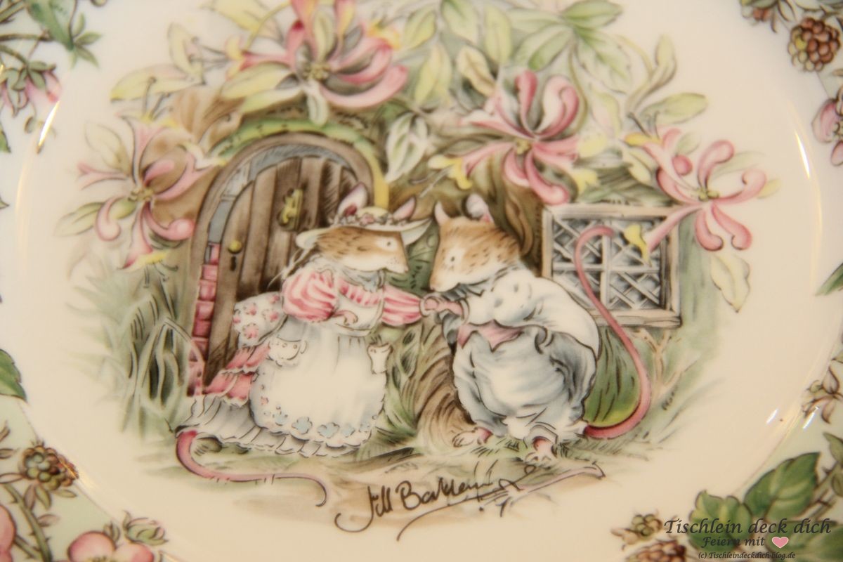 Seit mehr als 25 Jahren (oh je, wie doch die Zeit vergeht) steht das Porzellan von Bramley Hedge in unserem Schrank. Angefangen zu Sammeln habe ich es damals, als mir meine Freundin Gaby ein Schälchen zum Geburtstag schenkte und dieses nicht alleine bleiben sollte. Mittlerweile wird das Kaffeeservice eher selten bis gar nicht von mir genutzt. Ist eigentlich schade, wo doch Vintage und Shabby mittlerweile so beliebt geworden sind. Sie ist doch einfach zu putzig die kleine Mäusefamilie, deren Leben man auf Tellern und Tassen der Vier Jahreszeiten, Autumn- Winter- Spring-Summer, beiwohnen kann. Und da vier Gedecke doch meistens nicht reichen kam noch ‚ The Birthday‘ und ‚The Engagement‘ hinzu.